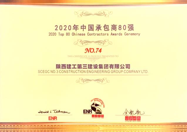 陜建三建集團榮獲“2020年度中國承包商80強”企業